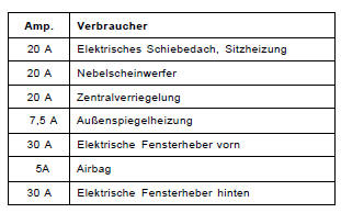 : die sicherungsbelegung ist abhängig von der ausstattung und vom baujahr des fahrzeuges. Die aktuelle belegung der sicherungen ist mit symbolen im deckel vom sicherungskasten gekennzeichnet, sowie in der betriebsanleitung enthalten.